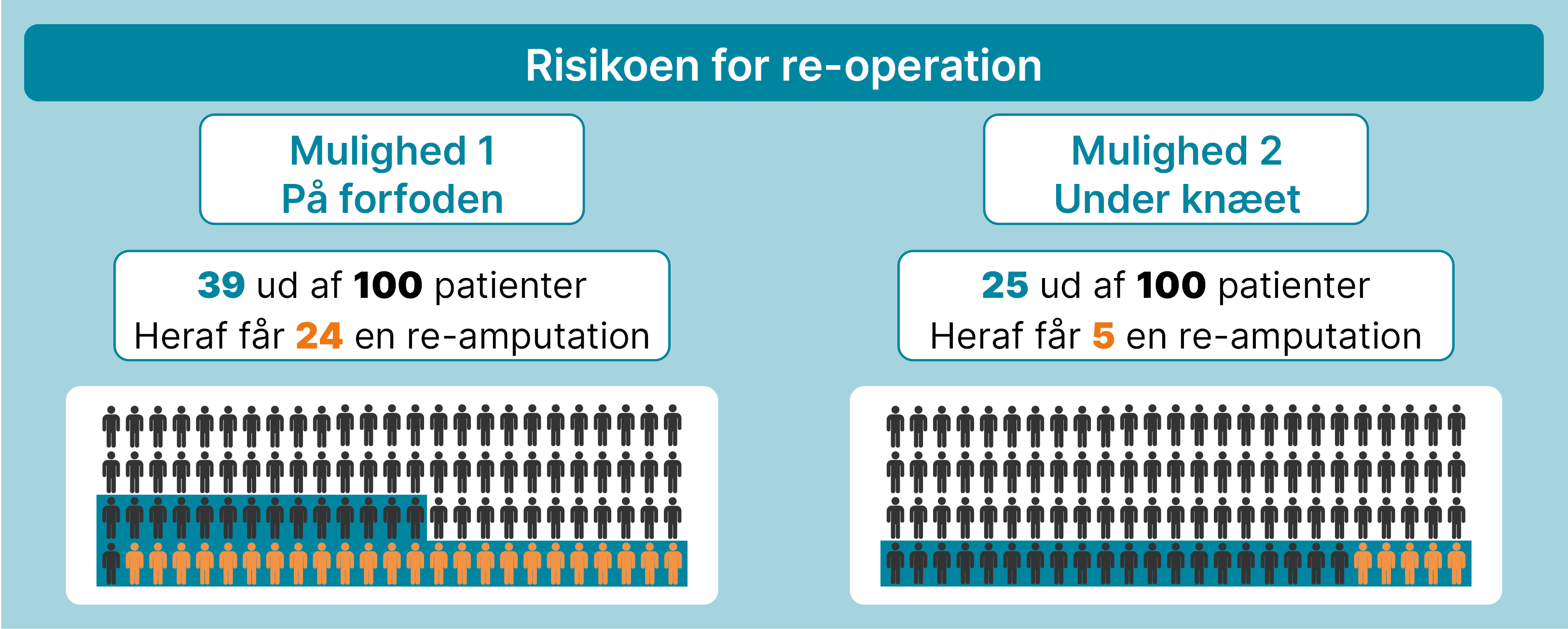 Her kan du se, hvor mange ud af 100 patienter der får brug for en ny operation eller en ny amputation det første år efter en af de to muligheder.