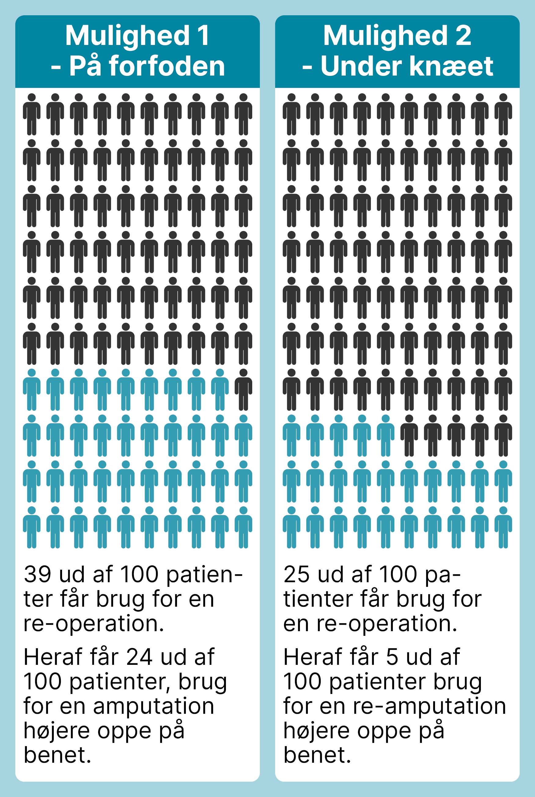 Re-operation: Der fjernes ikke mere af benet. Man opererer i væv og bløddele for at hjælpe helingen.