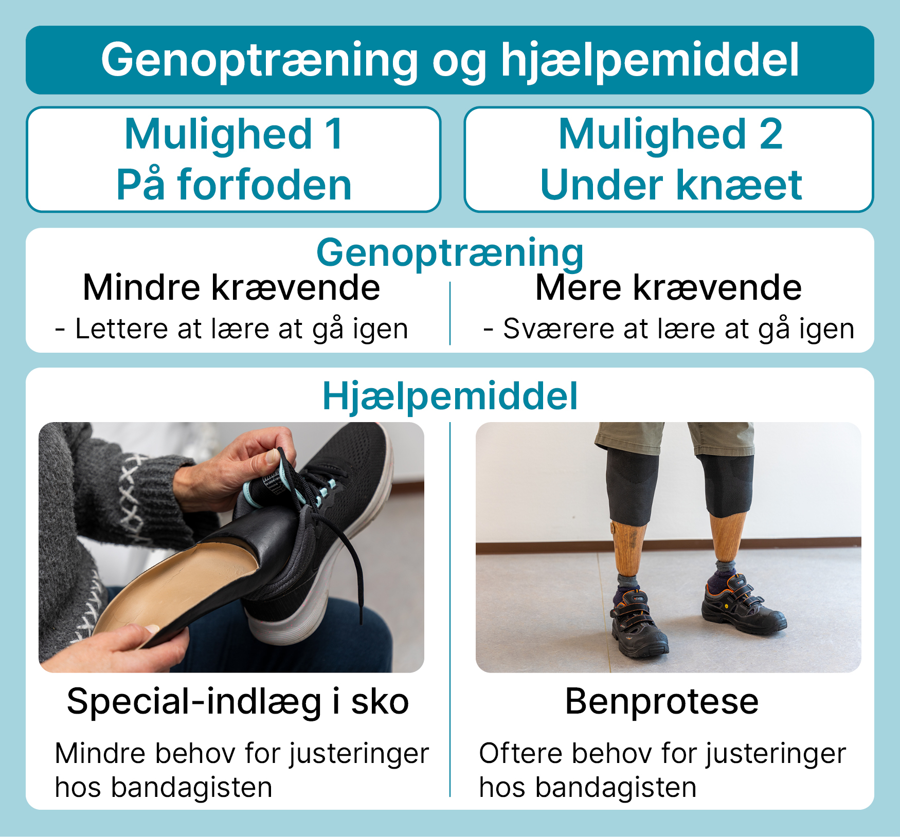 Herunder kan du se forskellene på genoptræningen efter en amputation på forfoden og en amputation under knæet: