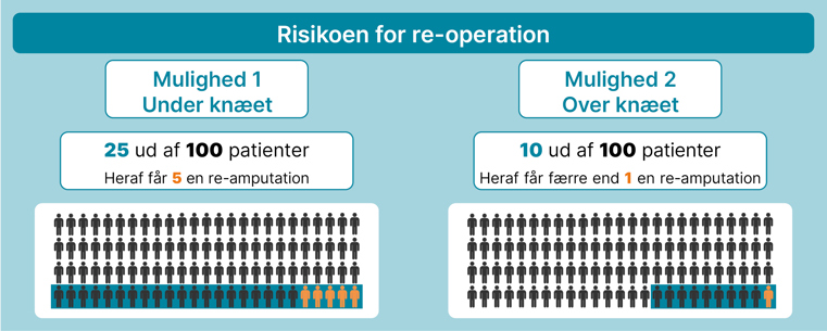Her kan du se, hvor mange ud af 100 patienter der får brug for en ny operation eller en ny amputation det første år efter en af de to muligheder.